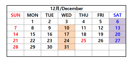 7. 每周1天课程(周三):12月10日、17日、24日, 31日