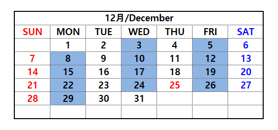 5. 每周2天课程(周一/周三):12月3日 ~ 12月29日