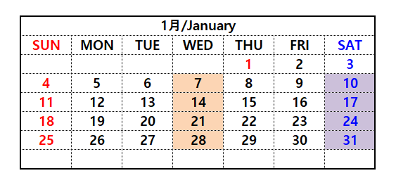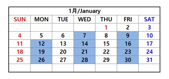 7. 每周1天课程(周三):1月7日、14日、21日, 28日