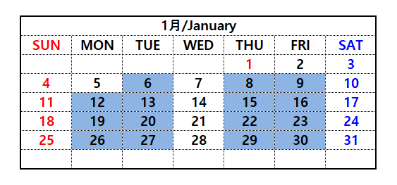 3. 每周2天课程(周二/周四):1月6日 ~ 1月29日